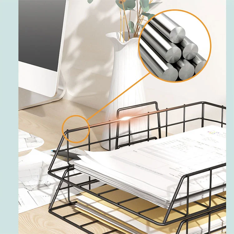 Mga Paalala: Ang ilalim ng metal tray file storage rack ay pinakinis, kaya hindi nito magasgasan ang tabletop. Gayunpaman, inirerekomenda namin ang paggamit ng mga anti-slip pad o tablecloth kapag inilalagay ito sa isang mahalagang ibabaw.